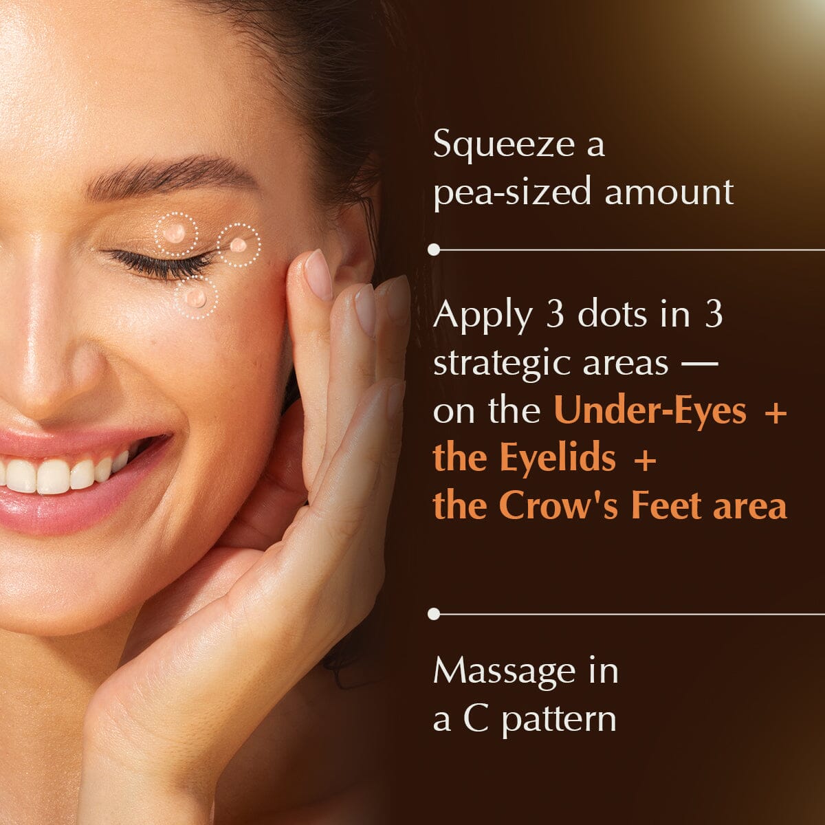 Apply 3 dots in 3 strategic areas — on the Under-Eyes + the Eyelids + the Crow's Feet Region